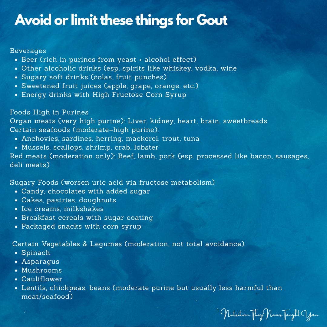 Recap → Not only direct consumption of purine rich foods but uric acid can also occur due to high consumption of fructose. When fructose is metabolized in the body, it produces purines, which are converted into uric acid. This process is known as de novo purine synthesis → making gout affordable to anyone!
