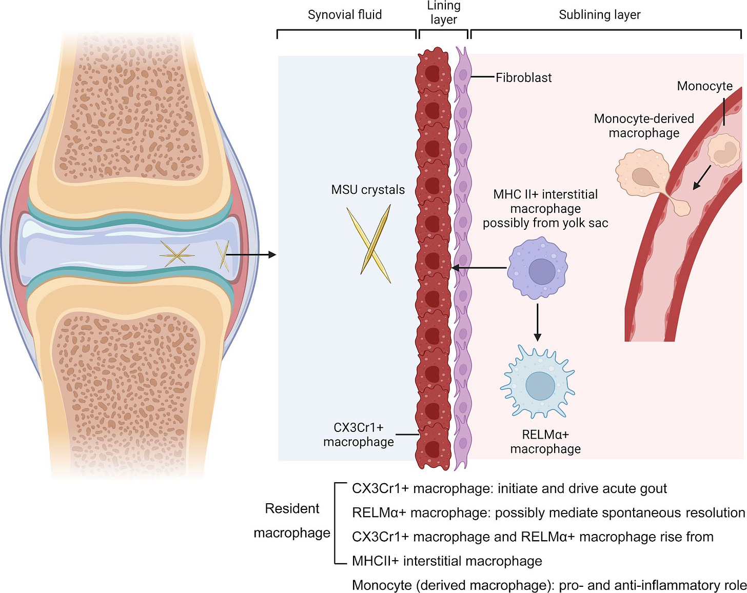 These MSU crystals in the soft tissues cavities of your joints are not the only problem or immobility, inflammation and pain. It's a problem of immunity. MSU crystals are highly immunogenic (meaning the ability of a substance to provoke an immune response within the body). Once these crystals start to form initially the body will fight back by a phagocytosis, sending monocytes and macrophages (a special type of white blood cells) and activating NALP3 inflammasomes (cute name? Just wait) triggering the release of IL-1 (pro-inflammatory cytokine -which recruits immune cells to infection sites) kind of a signal to the body that something is wrong at this site.